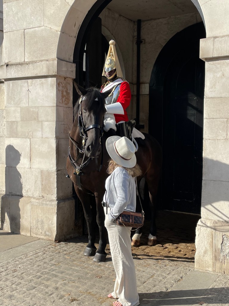 We arrived on Tuesday evening – the day after the Queen’s funeral – and sadly our tours of Windsor and Buckingham were cancelled. But at 9am on Thursday we did get to walk to Kensington Palace and enjoy that tour! Then we walked through Hyde Park, down Rotten Row, to the Wellington Arch, down to Buckingham Palace and back up the Mall. We made it to the Horse Guards just in time to watch the morning parade as they came out of the stables at 11am and petted the horses.
